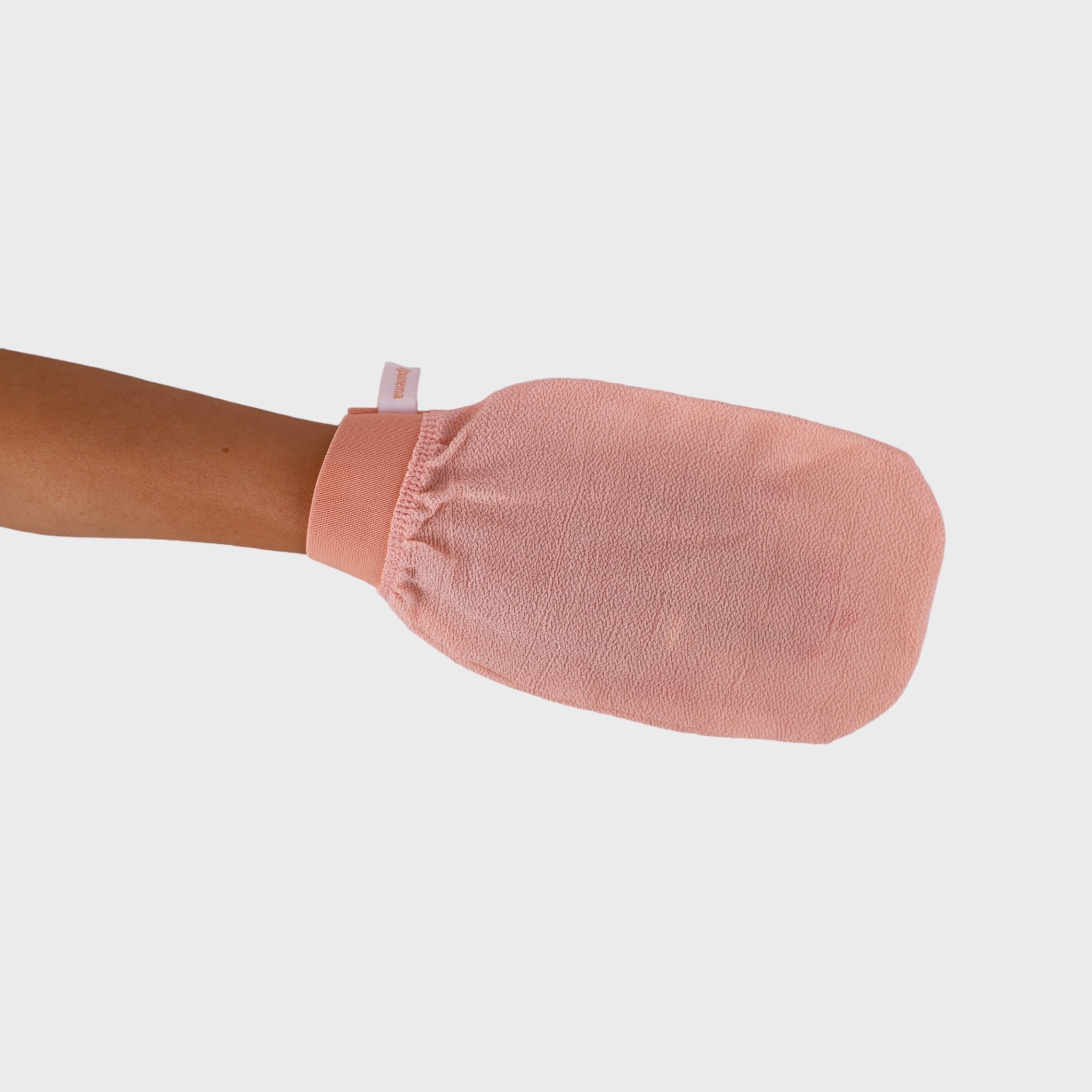 Lege deine Hand in den Handschuh und gleite sanft in kreisförmigen Bewegungen, um abgestorbene Haut abzutragen. Keine Seifen oder Reinigungsmittel erforderlich.