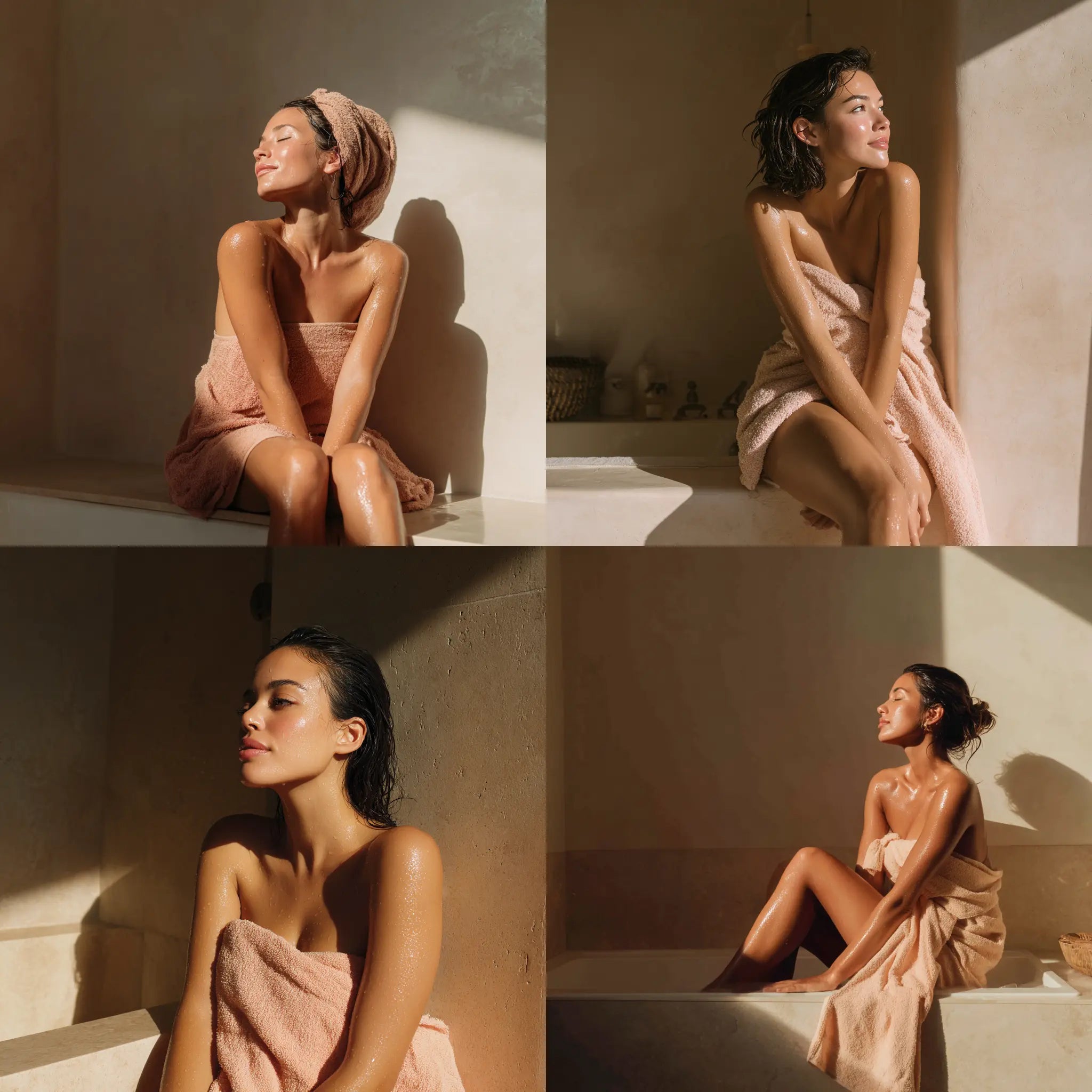 1. Einweichen: Beginne dein Hautpflegeritual mit einem warmen Bad, um die Haut aufzuweichen. Befeuchte dann unseren Seiden-Peelinghandschuh mit warmem Wasser.
